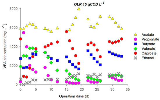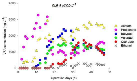 The significant production of valerate (up to 1 g L−1 in the OLR 15 test) could be ascribed to amino acids fermentation [67] or propionate upgrading [17]. Nevertheless, considering that in the fifth cycle of the OLR 15 test, protein degradation even decreased (Figure S2), and it is quite likely that a good portion of valerate was produced through the latter pathway. Indeed, the presence of acetyl-CoA produced along EDs oxidation can favour the propionate elongation to valerate.