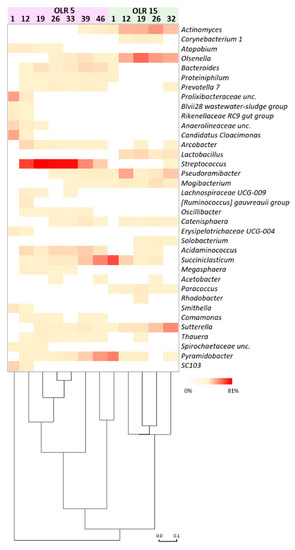 Interestingly, an increase of reads affiliated with Succiniclasticum (0–36.6%) and Pyramidobacter (0–30.4%) was observed during the concomitant decreasing trend of the relative abundance of reads belonging to Streptococcus (from 32 to 45 day of operation). Sequences belonging to Actinomyces, Olsenella, Psudoramibacter, Acidaminococcus, and Sutterella were found to a minor extent. The sequencing results of the biomass in the reactor that operated at 15 gCOD L−1d−1 showed a large occurrence of reads mainly affiliated with the genera Actinomyces (range 3–31.9% of total reads), Olsenella (0.3–46.1%), Lactobacillus (0–9.4%), Pseudoramibacter (1–26.5%), Mogibacterium (0.1–6.5%), and Sutterella (0.2–35%) (Figure 3). A marked decrease of reads belonging to the genera Succiniclasticum (55.5–0%) and Pyramidobacter (38.6–0.1%) was observed over the operation.