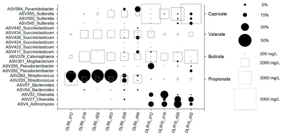 Bubble plot depicting the relative abundance (as % of total reads) of the main ASVs (black circles) and the concentration of propionate, butyrate, valerate and caproate (mg L−1) (white squares) during reactors operation.