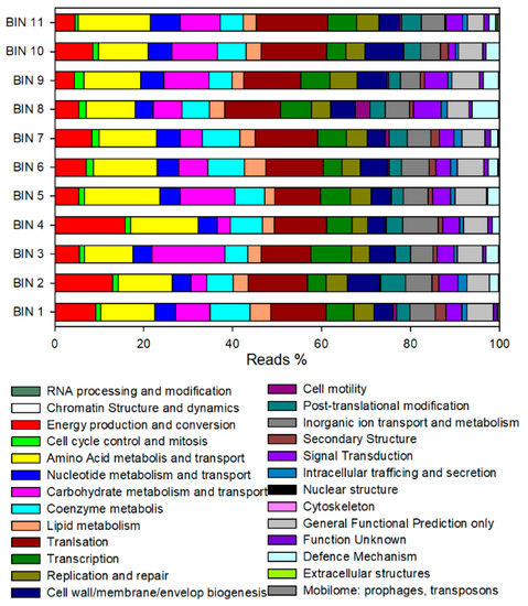 The major functional categories of the extracted bins were similar (Figure 5). The energy production and conversion, amino acid transport and metabolism, carbohydrate metabolism and transport, lipid metabolism, and translation were the most abundant functions identified. The relative abundance of reads assigned to cell motility, nuclear structure, cytoskeleton, extracellular structures, and mobilome were the lowest among all the bins.