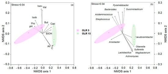 Non-metric MultiDimensional Scaling ordination plot (NMDS) ordination plots, based on Euclidean distance matrixes of log-transformed data. The vector length is proportional to the correlation between the NMDS axes and each process parameter and microbiological values. The stress value (i.e., <0.2) suggests for an accurate representation of the dissimilarity among samples. (a) The variation pattern of volatile fatty acids (mg L−1) (Ac, acetate; But, butyrate; Cap, Caproate; Isob, isobutyrate; Isov, isovalerate; Prop, propionate; and Val, valerate); Ethanol (mg L−1), carbohydrates (C) (mgCOD L−1), proteins (mgCOD L−1) (P), and pH. (b) The relative abundance of sequencing reads at taxonomical genera level (≥5% in at least one sample) is projected onto the NMDS ordination synthesising the chemical dissimilarity. Colours indicate the two OLR conditions.