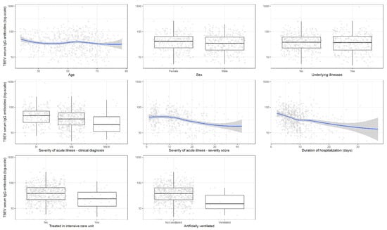 Association of tick-borne encephalitis virus IgG antibody levels in serum (log-scale) with basic demographic and clinical findings including disease severity. Legend: TBEV, tick-borne encephalitis virus.