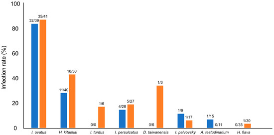 Spiroplasma-positive rates of different tick species. Blue and orange bars represent male and female ticks, respectively. The numbers at the top of the bars indicate the number of Spiroplasma-positive ticks/number of tested ticks.