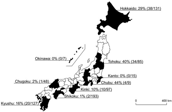 A map of Japan showing the Spiroplasma-positive rate of each geographical block. The numbers in the parentheses refer to the number of Spiroplasma-positive ticks/number of tested ticks.