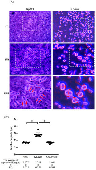 Deficiency of crr enhanced CPS production in K. pneumoniae. (A) Light microscope images of bacteria after India ink staining. Capsular saccharide was visualized by a cleared zone (ink exclusion) around the bacteria. (i) Images were obtained at 400 × magnification. (ii) Enlargement of the rectangle outlined with a white dashed line in (i). (iii) Enlargement of the rectangle outlined with a white dashed line in (ii). (iv) The width of the capsule was analyzed by measuring the red dashed line in (iii). The scale bar, white horizontal line, in subfigure (iii) = 1 µm. (B) Representative images of bacteria on Congo red agar (CRA) plates. (C) Quantification of bacterial CPS. (D,E) Transcriptional analysis of the housekeeping gene recA and cps locus genes, including galF, wzi and gnd, by dye-based RT-qPCR. The relative mRNA levels indicate that the mRNA amount in KpΔcrr was normalized to that in KpWT in (D) or that the mRNA amount in KpΔcrr/crr was normalized to that in KpΔcrr/vc in (E). KpWT: K. pneumoniae STU1 wild-type. KpΔcrr: K. pneumoniae crr mutant. KpΔcrr/crr: K. pneumoniae crr mutant carrying pBAD33::crr (crr complemented strain). KpΔcrr/vc: K. pneumoniae crr mutant carrying pBAD33 (vector control). The photos and data regarding KpΔcrr could be used to represent those of KpΔcrr/vc in (A,B,C) because of their similar phenotypes. The asterisk (∗) represents p < 0.05.