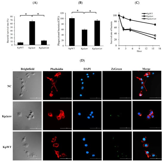 The effect of crr on resistance to hydrogen peroxide, macrophage ingestion and bactericidal activity in macrophages. (A) Survival rate of bacteria exposed to 1% hydrogen peroxide for 30 min. The survival rate of each strain was calculated by dividing the CFU of bacteria with H2O2 treatment by the CFU of bacteria without H2O2 treatment. (B) Evaluation of bacteria ingested by macrophages. After 1 h of infection and 30 min of antibiotic treatment, the macrophages were lysed and plated to calculate the recovery of intracellular bacteria. Values shown are the mean CFU of viable bacteria per well ± SD of three independent experiments. (C) Survival rate of intracellular bacteria resistant to phagocytosis by macrophages after 1 h of infection, 30 min of antibiotic treatment and incubation for 2, 5 or 16 h. The survival rate of each strain was calculated by dividing the CFU of viable bacteria after incubation by the CFU of viable bacteria without incubation (0 h). (D) Internalization of bacteria by macrophages observed by CLSM. The macrophages were infected for 1 h with bacteria carrying pBSK-Km::ZsGreen (green). After 30 min of antibiotic treatment, the cells were visualized by staining F-actin with phalloidin (red). The cell nuclei were stained with DAPI (blue). Representative 2D images were acquired by choosing the maximum intensity projection from 3D CLSM images in three different experiments. Scale bar (white horizontal line in each subfigure) = 50 µm. NC: no bacteria, as a negative control. KpWT: K. pneumoniae STU1 wild-type. KpΔcrr: K. pneumoniae crr mutant. KpΔcrr/crr: K. pneumoniae crr mutant carrying pBAD33: crr (crr complemented strain). The data for the crr mutant could be used to represent that of the K. pneumoniae crr mutant carrying pBAD33 (vector control) in (A–C) because of their similar results. The asterisk (∗) in (A) and (B) represents p < 0.05. (C) The p-values of comparing the data from KpWT and KpΔcrr at second hour, 5th or 16th hour were less than 0.05.