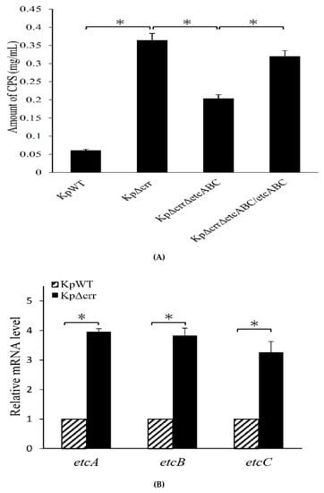 In this study, we observed that the K. pneumoniae crr mutant showed hypermucoviscous colonies on agar plates. Then, the CPS amounts of the crr mutant and wild-type were quantified. By RT-qPCR, we found that the transcriptional activities of genes in the cps cluster were increased in the crr mutant compared to those in the wild-type. Infecting macrophages, we showed that the crr mutant was more resistant to phagocytosis than the wild-type. Subsequently, as determined by RT-qPCR, the mRNA levels of another EII complex, etcABC, in the crr mutant were greater than those in the wild-type. By gene deletion, we found that glucose-specific EIIA Crr played a role in the regulation of CPS production via the etcABC.