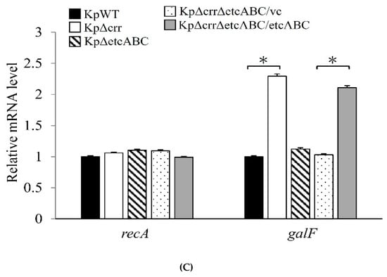 We previously reported that overexpression of KPN00353-KPN00352-KPN00351, homologs of EtcABC, increased the production of CPS in K. pneumoniae [31]. In addition, the CPS production of the etcABC mutant was not significantly different from that of the wild-type (average CPS amount of etcABC mutant and wild-type was 0.060 mg/L and 0.061 mg/mL, respectively, and Figure 3C). Therefore, we compared the transcription levels of etcABC in the crr mutant and wild-type. As observed by RT-qPCR, the amounts of etcA, etcB and etcC mRNAs in the crr mutant were higher than those in the wild-type (Figure 5A), indicating that deficiency of crr may activate the transcription of etcABC. To elucidate the role of etcABC in the crr mutant, etcABC was deleted in the crr mutant. By quantifying the CPS, we determined that the CPS amount in the Δcrr/ΔetcABC double mutant was lower than that in the crr mutant but not as low as that in the wild-type. Complementation of etcABC in the Δcrr/ΔetcABC double mutant restored the CPS amount close to that in the crr mutant (Figure 5B). Since we observed that genes in the cps cluster (galF, wzi and gnd) were affected by crr (Figure 3D,E), the transcriptional activity of galF in the Δcrr/ΔetcABC double mutant was detected by RT-qPCR using recA as a reference. The results demonstrated that the mRNA levels of galF in the Δcrr/ΔetcABC double mutant were lower than those in the crr mutant but were increased by complementation of etcABC in the crr mutant (Figure 5C), indicating that CPS production in K. pneumoniae could be affected by Crr via EtcABC overexpression.