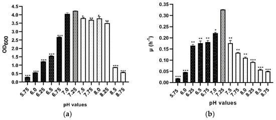 Effect of pH stress on the growth profile of Hfx. mediterranei R4 grown in Hm-DM. Data are based on three independent cultures. (a) Maximum OD600 in stationary phase (reached at different times). (b) Average growth rate. Plotted values are the mean of triplicate measurements, and error bars represent ± SD. * p ≤ 0.05; ** p ≤ 0.01; *** p ≤ 0.001. In grey, the control; in black, acidic pH; in white, alkaline pH.