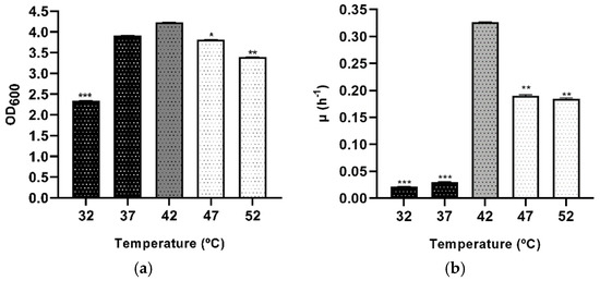 As in the other previous stress conditions, all the cultures’ stationary phases were statistically compared and analyzed, highlighting that this stationary phase was the maximum growth reached at different times by cultures. There was a significant difference detected in mean values across 32, 47, 52 °C, and the control (42 °C) (Figure 3a); therefore, the growth curves of cultures that showed a difference were displayed (Figure S3). Furthermore, focusing on growth kinetics, changes in the specific growth rates and doubling times of the groups are shown in Figure 3b and Table 3. These values were affected by changes in temperature. As shown in Figure 3b, at temperature values lower than the optimal (black bars), cells grew much lower than at high values (white bars). Moreover, the lowest growth values were found at 32 and 37 °C with 0.02 and 0.03 h−1, respectively.