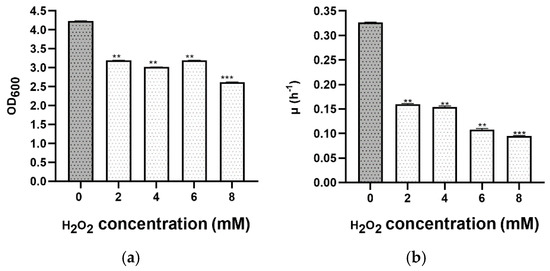 The specific growth rate and doubling time of the exponential growth phase were determined at each concentration of H2O2 (Figure 4b and Table 4), using the data from the growth curve. As expected, the higher the peroxide concentration s, the slower the growth rate and the higher the doubling time. Similar values of cell growth were observed in cultures with 2 and 4 mM of H2O2.