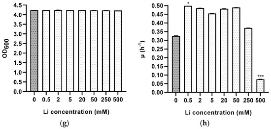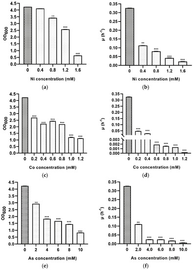 Effects of heavy metal stress on the growth profile of Hfx. mediterranei R4 grown in Hm-DM. Data are based on three independent cultures. (a) Maximum OD600 in stationary phase adding Ni2+ (reached at different times). (b) Average growth rate with Ni2+ (c) Maximum OD600 in the stationary phase adding Co2+ (reached at different times). (d) Average growth rate with Co2+ (e). Maximum OD600 in stationary phase adding As5+ (reached at different times). (f) Average growth rate with As5+. (g) Maximum OD600 in the stationary phase adding Li+ (reached at the same times). (h) Average growth rate with Li+. Plotted values are the mean of triplicate measurements, and error bars represent ± SD. * p ≤ 0.05; ** p ≤ 0.01; *** p ≤ 0.001. In grey, control without toxic metals; in white, with toxic metals.