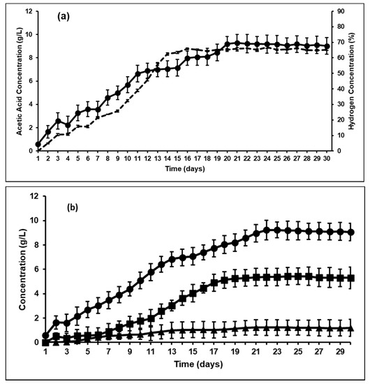 (a) Hydrogen concentration in headspace (wt%) versus acetic acid concentration (g/L); and (b) volatile fatty acids (VFA) profile; in control bioreactor after 2-bromoethanesulfonate (BES) addition and methanogenesis inhibition. (--- Hydrogen concentration (wt%); ● Acetic acid concentration (g/L); ■ Propionic acid concentration (g/L); ▲ Butyric acid concentration (g/L)).