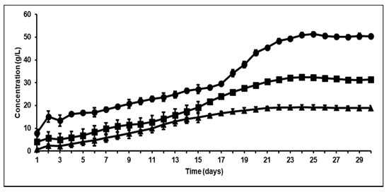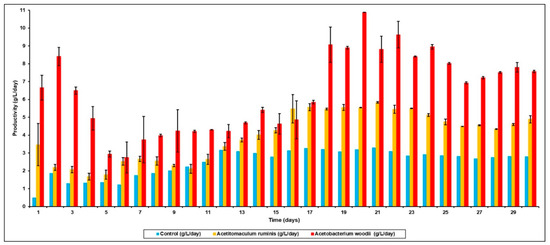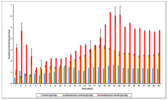 Previous studies have indicated that any changes to bioreactor performance after bioaugmentation are usually only operational for short periods of time [37]. This is primarily because of competition between the different microbial strains, and the fact that a system such as the rumen has developed over long periods of time and the resulting micro-flora is based on survival of the fittest. However, when methanogenesis is inhibited there is an opportunity for other strains to take up the space inhabited by these microbes, and as shown, this will lead to the increased production of more VFA, especially acetic acid. This effect is successfully shown in Figure 3, where the VFA productivity after bioaugmentation with A. ruminis or A. woodii was 6.2 g/L/day and 10.4 g/L/day, respectively, almost 2- to 3-fold higher than in the control reactor without bioaugmentation.