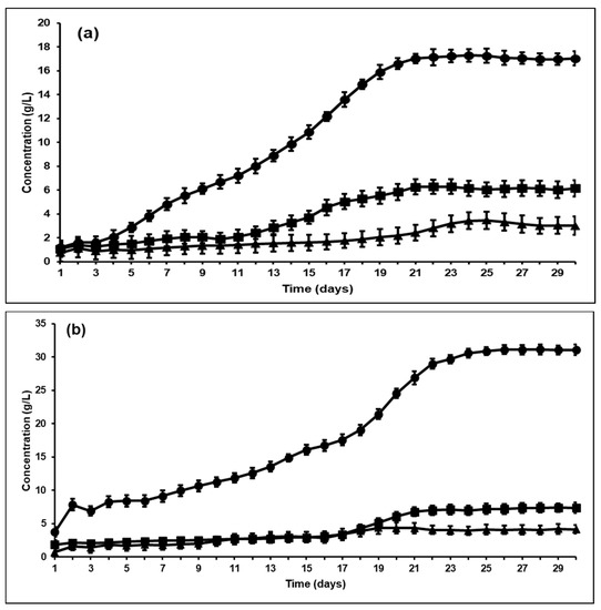 As indicated in Section 2.5, all the bioreactors showed stable performance for two retention times before any microbial manipulations were made and such stable performance has been previously shown [30]. Hence, in this study, day 0 is indicative of the bioreactor sample immediately after adding BES to the system and based on this assumption, the second addition of BES to the bioreactors was on day 15. This was consistently followed for both the control and the bioaugmented bioreactor. The VFA profile in the control bioreactor after BES addition is shown in Figure 1. As expected, it was found that after BES was added there was a drop in methane production to less than 5 wt% (not shown), and the hydrogen concentration in the headspace started to increase, reaching a maximum value of 60 wt% after 5 days (Figure 1a). Similar trends were observed in other studies, where inhibition of methanogens resulted in an increased hydrogen partial pressure in the headspace [18]. Studies have shown that with complete inhibition of methanogenesis, increased from 0.087 mM/day to 1.83 mM/day in continuous cultures [32]. It can be seen from Figure 1b that acetic acid is the most prominent VFA produced, along with propionic and a low amount of butyric acid (very minute concentrations of valeric acid were produced and it was not consistent; hence, it is not shown in the graphs).