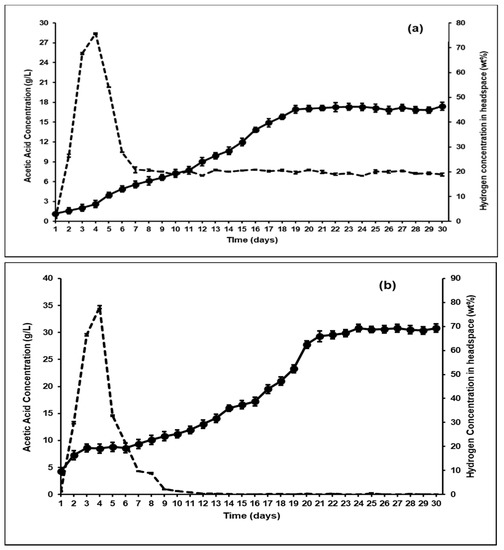 Hydrogen concentration in headspace(wt%) versus acetic acid concentration (g/L) in semicontinuous bioreactors bioaugmented with (a) Acetitomaculum ruminis and (b) Acetobacterium woodii (--- Hydrogen concentration (wt%); ● Acetic acid concentration (g/L)).