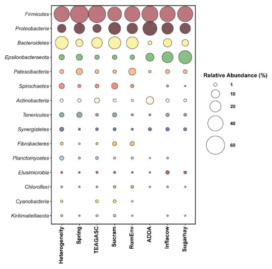 Only Firmicutes, Proteobacteria, and Epsilonbacteraeota were present in each single sample analyzed. The latter is a newly proposed phyla, that derives from the combination of Epsilonproteobacteria, formerly included in Proteobacteria, and of the order Desulfurellales (Deltaproteobacteria) [38]. The same authors recently proposed to replace the name of this new phylum with Campylobacterota [38,39], given that Campylobacter is one of its most widely known members. The six core phyla detected correspond to the most abundant phyla across all the studies, with the exception of Spirochaetes, which was not identified in the project ADDA [18,19]. While Neubauer et al. [19] identified this phylum only in the particle-associated microbiota, Petri et al. [18] found Spirochaetes to be present at low abundance on the ruminal epithelium. Since the methods were extremely similar for both studies, the presence or absence of this phylum could be due to the bioinformatics analyses performed. Proteobacteria and Firmicutes, in different proportions, were the most abundant phyla across all the studies analyzed. In accordance with our findings, the studies from De Mulder and Neubauer [19,23] found Bacteroidetes to be less present in the epimural niche compared to other ruminal microenvironments.