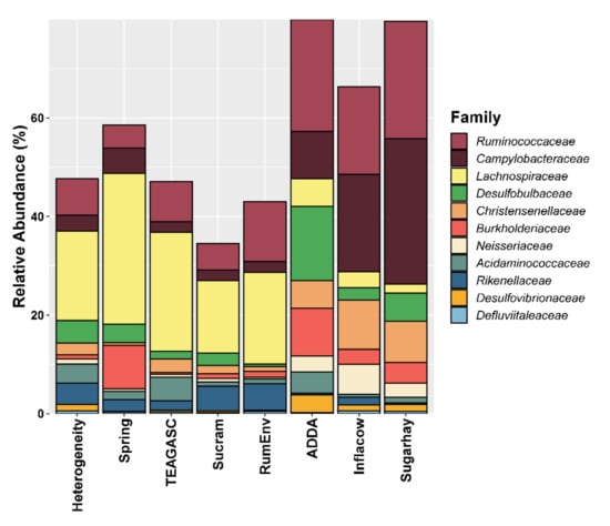 Features belonging to Ruminococcaceae UCG-014 (1.55 ± 0.07%), Ruminococcaceae UCG-010 (0.69 ± 0.04%), and Ruminococcaceae NK4A214 (6.76 ± 0.41%) group were identified as core in this meta-analysis, and have been previously reported as present in the whole gastrointestinal (GI) tract of cattle [46]. The latter is a relatively new genus, which has been recently added to the SILVA database, as it was previously included in broader classification at the family level [47]. Therefore, this group was not described in any of the studies included in this meta-analysis, as it was before considered among the Ruminococcaceae. Although bacteria belonging to this family are well known for their fibrolytic activity, Ruminococcaceae NK4A214 group were identified and cultured for the first time in 2011 [48], and their exact function in the rumen is still unknown. Burkholderiaceae is a Gram-negative family with an incredible ecological and metabolic variability, with several species classified as pathogens for humans, animals, and plants. Their exact role in epimural ruminal microbial community requires further investigation, but their capacity to adapt to challenging conditions could explain their presence in the core epimural microbiota [49], making the genus Comamonas (4.53 ± 0.32%) a very interesting epimural microbe. Family Desulfovibrionaceae, also identified as core, being able to reduce sulfate and produce acetate through the metabolism of lactate and hydrogen [50,51]. Families Lachnospiraceae and Desulfobulbaceae, identified as highly prevalent in three studies, [21,23,24], were confirmed as part of the core microbiota in our study. Lachnospiraceae UCG-010 (0.46 ± 0.02%) was also identified as part of the core microbiota. Lachnospiraceae are Gram-positive bacteria responsible for pectin fermentation and formate production [52], according to some authors. In other studies, the known role as fibrolytic bacteria [12,53] of unclassified Lachnospiraceae together with unclassified Ruminococcaceae was confirmed by being positively correlated with acetate production and an increased acetate to propionate ratio [54]. Despite being frequently identified as part of the ruminal microbiota, family Desulfobulbaceae is rarely examined and discussed. Some of its components, in particular belonging to the genus Desulfobulbulbus (5.79 ± 0.35%), have been described as sulfur compounds reducing and oxygen scavenging bacteria [23,24].
