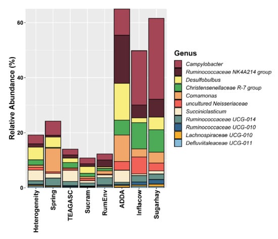 Campylobacteraceae was represented in 100% of the samples, confirming the importance of the recently proposed Campylobacterota phylum in the epimural fraction of the rumen microbiota. Interestingly, Campylobacter (12.1 ± 0.66%) was also the only genus to be detected in all the samples and was also the most commonly described genus across all studies included in this meta-analysis (Figure 3). Out of 344 bacterial genera, Campylobacter (15.5%), Kingella (7.8%), Desulfobulbus (4.7%), and Brachymonas (4.2%) were previously found to be the most abundant epimural bacteria [9]. Project Inflacow described the most abundant epithelial OTUs to be Campylobacter hyointestinalis, followed by Kingella oralis [9,10]. Results of our meta-analysis partially confirm these findings, as the feature classified as genus Campylobacter is 100% similar to Campylobacter hyointestinalis (NCBI Accession number: NR_115710.1). As previously discussed, most of the studied members of the Campylobacteraceae family are pathogenic strains, such as C. jejuni [40,41]. However, the exact role of these microbes in the epithelial community remains unknown. No other studies report the presence of K. oralis, which might suggest that this is a bioinformatics artifact or a study-specific effect. Two features identified as an uncultured Neisseriaceae (2.79 ± 0.19%) are classified in the NCBI database as Neisseria oralis (NCBI Accession number: NR_118249.1). Neisseria has been previously found to be associated with oxidative stress response in a transcriptome study of the cattle epimural microbiota using the same samples as Inflacow [42]. Likewise, most of the literature concerning Neisseriaceae refers to pathogenic bacteria. Members of this family are found in many different animal species, and a few strains are associated with microbiological communities populating the oral cavity in ruminants [43]. Some species, such as N. sicca, have been suggested to have urea hydrolysis activity in the rumen [44], whereas N. oralis has been demonstrated to be able to ferment lactose [45].