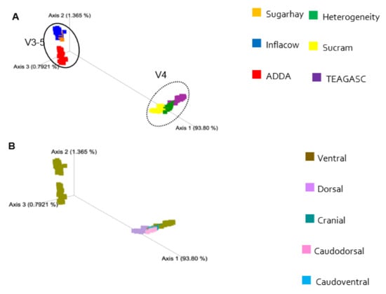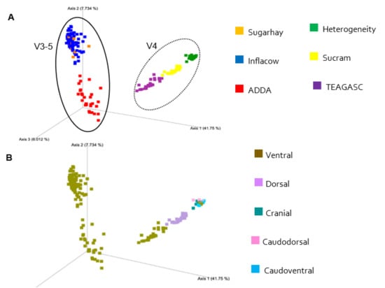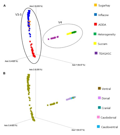 Alpha diversity metrics were checked for normality using the Shapiro-Wilk test (p < 0.05) and compared among studies using a non-parametric Kruskal-Wallis test with a pairwise Wilcoxon rank sum test in the R software environment [34]. Significance was considered at a p-value of < 0.05 after correction with the Benjamin-Hochberg procedure [35]. Principal-coordinate analysis (PCoA) was used to visualize distances between beta-diversity matrices. Permutational multivariate analysis of variance (PERMANOVA) using adonis [36] with 999 permutations and analysis of similarities (ANOSIM) was used to analyze the unweighted and weighted UniFrac distances and the Bray-Curtis dissimilarities matrices regarding study, country of origin, farm, gender (cow vs. steer), individual variability, biopsy location, hypervariable region, and primer set used. Permutational analysis of multivariate dispersions (PERMDISP) was used to test the homogeneity of dispersion for each metadata category analyzed previously [36]. Linear discriminant analysis effect size (LEfSe) (https://huttenhower.sph.harvard.edu/galaxy/ (accessed on 30 April 2020), The Huttenhower Lab, Boston, MA, USA) was used to determine which genera were significantly enriched according to the hypervariable region sequenced, and which metabolic pathways were overestimated in the different rumen locations. Genera and pathways that were more abundant in a particular group were identified by LEfSe using the non-parametric factorial Kruskal-Wallis (KW) sum-rank test (p < 0.05) and the effect size of each of these genera was estimated using linear discriminant analysis [37]. A LDA score (log10) of 4.0 was used as the cut-off to identify differentially abundant microbial genera and a score of 3.0 was used to identify differentially abundant metabolic pathways in the different rumen locations.