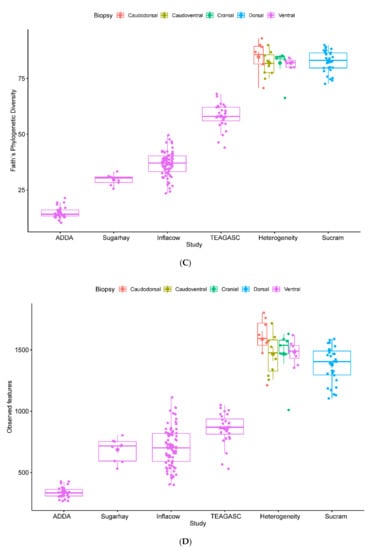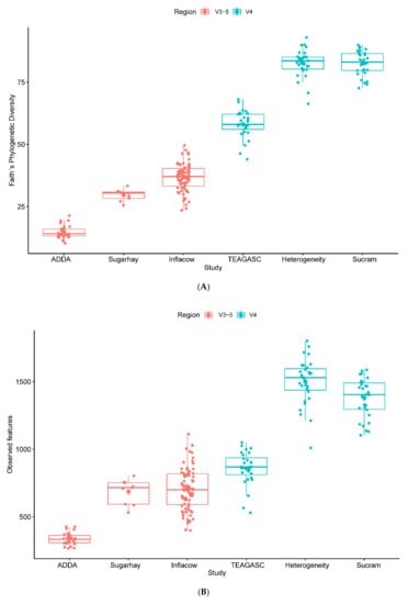 All metadata categories were tested using PERMANOVA, ANOSIM, and PERMDISP (Table 3). The individual study had the largest effect in the inter-sample diversity, according to the PERMANOVA results on weighted (R2 = 0.97, p = 0.001) and unweighted (R2 = 0.70, p = 0.001) UniFrac distance matrices, whilst the individual variability seems to have the largest effect in the Bray-Curtis dissimilarity matrix (R2 = 0.65, p = 0.001). ANOSIM using the weighted UniFrac distance matrix revealed that the most significant separation is given by hypervariable region (R = 1.00, p = 0.001), followed by study (R = 0.94, p = 0.001), country (R = 0.94, p = 0.001), farm (R = 0.90, p = 0.001) and primer set (R = 0.89, p = 0.001). In the unweighted UniFrac, however, primer set (R = 0.95, p = 0.001) is the most important factor after the hypervariable region, while in Bray-Curtis dissimilarities, country (R = 0.94, p = 0.001) shows up as the second most important factor. However, almost all of these results can be associated with a possible dispersion effect, as PERMDISP was significant (p < 0.05) in most of the cases. Exceptions were found in the weighted UniFrac distances for country (p = 0.15) and in the Bray-Curtis dissimilarities for the hypervariable region (p = 0.98). Comparisons of alpha diversity measures revealed significant differences between V3–5 and V4 (p < 0.001). In fact, samples obtained through V3–5 amplicon sequencing had overall fewer of observed features and lower diversity than samples sequenced using the V4 hypervariable region (Figure 8A,B).