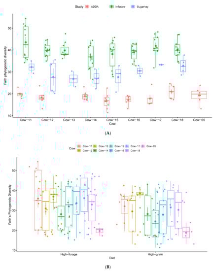 Samples from studies conducted in Austria (Projects Inflacow, ADDA, and Sugarhay) always used the same hypervariable region (V3–5) and biopsy location (ventral sac). Furthermore, the animals were housed in the same farm, allowing us to control the bias induced both by the farm and country. These samples were tested for the effect of the individual study, primer set, individual cow and diet. PERMANOVA on the weighted UniFrac distance matrix identified study (R2 = 0.37, p = 0.001), followed by primer (R2 = 0.22, p = 0.001) diet (R2 = 0.10, p = 0.001), and individual cow (R2 = 0.02, p = 0.015) as significant factors impacting the structure of the epimural microbiota. This is consistent with the permutational tests performed on the unweighted UniFrac distance matrix and the Bray-Curtis dissimilarity matrix. ANOSIM on the weighted UniFrac distance matrix shows that individual cow is not statistically significant (R = 0.02, p = 0.10). The composition of the GI tract microbiome, when geography and experimental setup is similar, is mainly affected by diet, despite the recognized influence of age, breed, environment and host genetics [12,46,67]. In fact, if we remove the sources of technical variation (study and primer), diet (p = 0.03) has a stronger effect than individual variability (Figure 9).