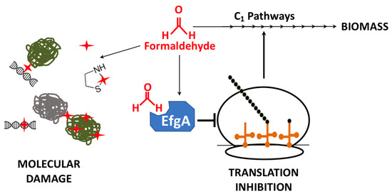 Fate of formaldehyde in M. extorquens. In one-carbon (C1) metabolic pathways of M. extorquens, formaldehyde is oxidized and used as a source of carbon and energy for biomass production. When levels of formaldehyde are excessive, free formaldehyde can form adducts on and/or crosslink a number of molecules (red stars), including proteins and nucleic acids, via amine and thiol groups. Additionally, elevated formaldehyde can bind EfgA a formaldehyde-sensing protein that, when bound to formaldehyde, halts translation.