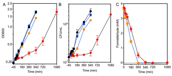 Formaldehyde concentrations in the growth medium were monitored by a colorimetric (Nash) assay. The resulting data showed that formaldehyde was gradually depleted in both the wild type and ΔefgA mutant cultures. Despite being growth arrested, wild-type cells depleted formaldehyde from the growth medium nearly as quickly as the ΔefgA mutant (WT = 0.54 ± 0.03 mM/h, ΔefgA = 0.62 ± 0.02 mM/h), suggesting they were in a quiescent, metabolically active state [44]. These data suggest that upon formaldehyde stress, M. extorquens cells can detoxify their environment and wait out this exogenous stressor.