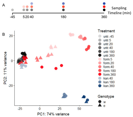 PCA of WT and ΔefgA mutant transcriptomes. (A) Timeline of sampling for RNA-Seq samples relative to time of treatment (t = 0); (B) Timecourse RNA-Seq was performed on WT (circles) and ΔefgA mutant (triangles) of M. extorquens grown in succinate minimal medium. During early exponential growth cultures were left untreated (untreat, gray gradient), or treated with 5 mM formaldehyde (form, pink gradient) or 50 ug/mL kanamycin (kan, blue gradient). Principal Component Analysis (PCA) was performed to assess the variance in the data. Each symbol represents one experimental replicate; the colors of each gradient darken over exposure time (−45 (pretreatment) to 360 min).