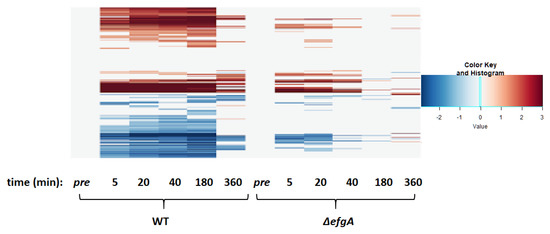 Temporal heatmap of WT and ΔefgA mutant response to treatment with formaldehyde. Genes differentially expressed (|log2-fold change| > 1) were identified by dividing Log2FC of sample/Log2FC of pretreatment sample (of the respective genotype). The up or down directionality of expression change is indicated by the red or blue color gradient, respectively.
