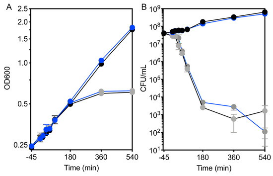 Monitoring growth of kanamycin treated cells by OD showed that the ODs of both genotypes continued to increase post-treatment and coincided with that of the untreated samples for at least 180 min and then plateaued (Figure 6A). Cell viability assays, however, showed that by 40 min, the viability of both genotypes had decreased by an order of magnitude and continued to fall rapidly (Figure 6B). These seemingly conflicting growth data are not uncommon as each of these approaches measure different features of growth. In light of the viability measurements, changes in OD cannot be attributed to proliferation. The increase in absorbance suggests that cells are increasing in size, a phenomenon that has been associated with stress and unchecked translation [45,46,47]. By the time the ODs plateaued (180 min), viability had already decreased by four orders of magnitude.
