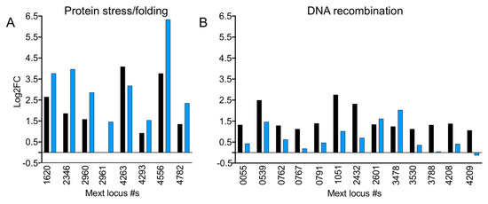 Genes involved in protein stress but not DNA recombination are upregulated in ΔefgA mutant in response to formaldehyde. Expression of genes involved in (A) protein stress/folding and (B) DNA recombination (as identified by gene ontology) are shown for WT (black) and efgA (blue). Log2FC of each gene in response to formaldehyde (5 min) is plotted.