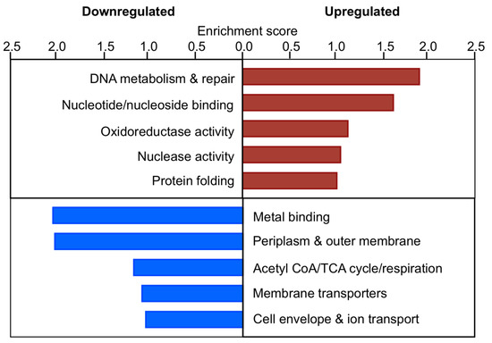 Gene ontology of the early formaldehyde response of ΔefgA mutant. Summary of functional group response of ΔefgA mutant at 5 min (fastest response) and 20 min (most intense response) was obtained using DAVID 6.7. Enrichment scores for each functional group are plotted for upregulated (red) and downregulated genes (blue).