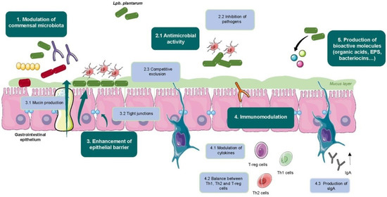 In the following subsections, we will describe some of the most characterized health-beneficial activities of Lpb. plantarum strains isolated from fermented foods. In general, the mechanisms by which probiotic bacteria mediate their health benefits are: (1) modulation of commensal microbiota; (2) exclusion or inhibition of pathogens; (3) enhancement of the intestinal epithelial barrier by increasing mucin production and tight junctions formation; (4) modulation of the immune system; and (5) production of bioactive molecules. Figure 1 presents a simplified graphic of the main mechanisms of action of Lpb. plantarum strains which will be further described in this review.