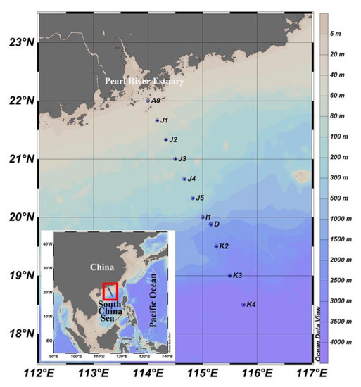 Temperature and salinity of the surface (5 m) water of the coastal nSCS sites (including A9, J1, J2, and J3; ranging from 28.16 to 29.65 °C, and 31.13 to 33.28, respectively) were significantly lower than the other sites (with mean ± standard deviation of 29.85 ± 0.13 °C and 33.48 ± 0.11, respectively) (Mann–Whitney test, p < 0.01). Vertically, water temperature decreased while salinity increased with the increasing water depth (Figure S1; Table S1). The concentrations of nutrients (NO2−, NO3−, PO43−, and SiO44−) showed a distinctly nearshore to offshore decreasing trend horizontally, while a surface to deep water increasing trend vertically (Figure S1, Table S1). The concentrations of Chl a of the coastal sites including A9, J1, and J2 were the highest at 5 m, while those of the offshore sites were found at the deep chlorophyll maximum (DCM) layer.