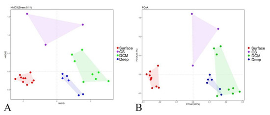 Plots of the nonmetric multidimensional scaling (nMDS) (A) ordination and principal coordinate analysis (PCoA); (B) based on Bray–Curtis dissimilarities of the protistan communities. Surface, surface waters; CS, coastal subsurface waters; DCM, deep chlorophyll maxima depth; Deep, deep waters.