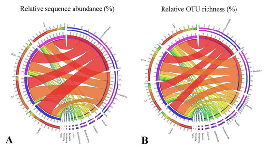 - Caporaso, J.G.; Kuczynski, J.; Stombaugh, J.; Bittinger, K.; Bushman, F.D.; Costello, E.K.; Fierer, N.; Peña, A.G.; Goodrich, J.K.; Gordon, J.I.; et al. QIIME allows analysis of high-throughput community sequencing data. Nat. Methods 2010, 7, 335–336. [Google Scholar] [CrossRef] [PubMed]