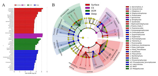 A protistan taxon with a high LDA score in a given group may serve as a potential biomarker for that group [78]. Protistan assemblages at Kingdom, Phylum, and Class taxonomic levels were used to identify the potential biomarkers in the four identified groups, i.e., Surface, CS, DCM, and Deep. Forty-nine protistan assemblages were identified using a logarithmic LDA size effect value of 3.5 (Figure 4A). Cladogram showed that Cercozoa, Bacillariophyta, and Picozoa were more abundant in group Surface. Notably, Bacillariophyta affiliated sequences exceeded 4000 in group Surface (Figure S4). Ciliophora (mainly Spirotrichea) was more abundant in group CS. Chlorophyta (mainly Prosino_Clade_7) and Telonemia were more abundant in group DCM. Radiolaria, Haptophyta (mainly Prymnesiophyceae), Streptophyta, Dinophyta, and Discoba were more abundant in group Deep. At the Kingdom level, seven discriminating lineages among the four groups were revealed by linear discriminant analysis effect size (LEfSe), i.e., Picozoa, Rhizaria, and Stramenopiles for group Surface, Alveolata for group CS, Archaeplastida for group DCM, and Hacrobia and Excavata for group Deep (Figure 4B).