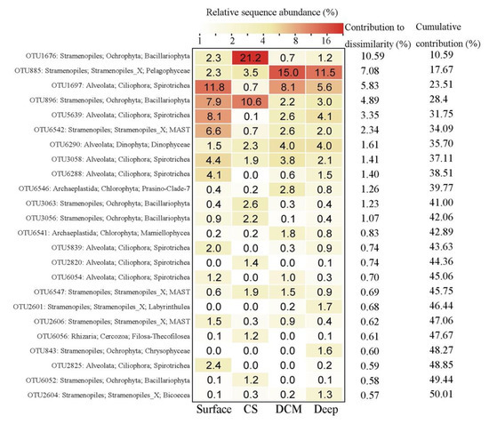 A total of 2573 OTUs were considered rare (defined as OTUs accounting for <0.01% of the total sequences), which totally accounted for ca. 78.1% of OTUs and ca. 5.5% of sequences recovered. The rare group was dominated by members in Alveolata (ca. 31.6% of the total OTUs), followed by members in Stramenopiles and Rhizaria (ca. 17.3% and ca. 12.3% of the total OTUs, respectively) (Figure S6B). Fifty OTUs were found to be rare in at least one sample (defined as <0.1% of sequences in a sample) but changed to abundant (defined as >1% of sequences in a sample) in at least one sample showing the shift between the locally rare and abundant OTUs. These OTUs were from a diverse of protistan groups including mainly Bacillariophyta in group Surface, Ciliophora in group CS, Archaeplastida in group DCM, and Bacillariophyta and Ciliophora in group Deep (Figure S7).