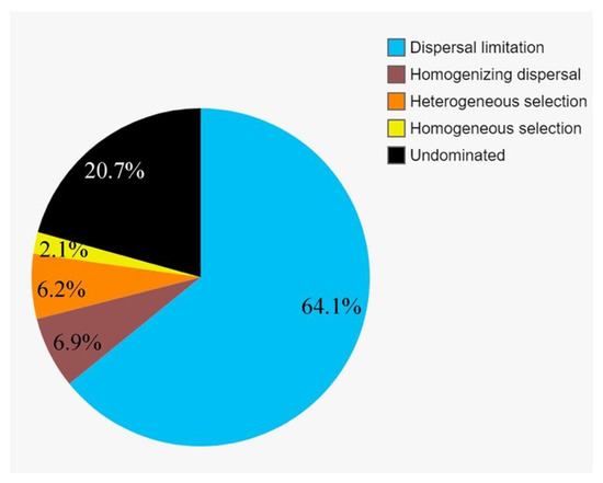 To further assess the contributions of spatial and environmental factors on the active protistan communities, quantification of ecological processes mediating community assembly was performed. Dispersal limitation was the primary driver for the community assembly and explained 64.1% of community turnover, followed by drift (ca. 20.7%) and homogeneous selection (ca. 6.9%). The rest processes, including homogenizing selection and heterogeneous selection, totally accounted for ca. 8.3% of community turnover (Figure 8).