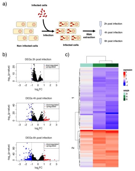 RNA sequencing and analysis of the expression profiles of Differentially Expressed Genes (DEGs). (a) HeLa cell infected with A. baumannii at three different infection time-points; RNA extraction was conducted at 2, 4 and 6 h after infection. (b) Volcano plots to portray the DEGs. DEGs at 2 h (top), 4 h (middle) and 6 h (bottom) after infection are represented: the X-axis indicates log2 (FC) and the Y-axis -log10 (p-value). The red dots represent upregulated genes (p-value < 0.05 and log2FC < −1) and the blue dots downregulated genes (p-value < 0.05 and log2FC > 1). This analysis revealed that the changes at 2 h were, globally, not significant compared to the position at 0 h. (c) Heatmap showing the relative expression levels for the DEGs (expression type: p-value < 0.05 and log2FC < −2/+ 2). Two main clusters were observed: downregulated genes (blue; cluster 1) and upregulated genes (red; cluster 2). Each column represents the expression level (log2 fold change) at different time-points: 2 h (light green), 4 h (green) and 6 h (dark green).