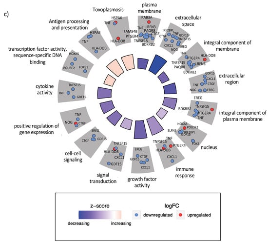 Gene Ontology (GO) clustering using chord diagrams for DEGs at three different time-points after infection. (a) Common DEGs at 4 h and 6h after infection, (b) DEGs exclusively found at 4 h and (c) DEGs exclusively found at 6 h. Red circles represent upregulated genes and blue downregulated genes. Overall GO differential expression z-score is also displayed as bars in the inner circle of the diagram. All GO terms and gene names are displayed in the diagrams.