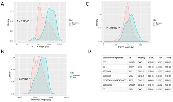 We used our gene expression analysis in an attempt to identify the possible post-transcriptional regulation of genes. We did not, however, detect any relevant trends in the upregulated genes, i.e., no genomic features that may explain coordinated regulation, but the downregulated genes had several features in common. A particularly interesting observation was that, in general, the downregulated transcripts had longer 5′ and 3′ untranslated regions (UTRs) (Figure 4A,B) and transcripts are also longer (Figure 4C). Unlike the coding region, both the 5′ and 3′ UTRs of mRNAs are enriched for Ribosome Binding Protein (RBP) sites []. Consequently, longer UTRs probably contain larger numbers of binding sites for RBPs, meaning that these genes are translated faster. This is compatible with a general repression of transcription after infection [].