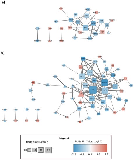 Cytoscape representation of the protein–protein interaction (PPI) network of our sorted DEGs. Representation of the PPI network at (a) 4 h and (b) 6 h. Network diagrams are useful for visualizing hub proteins and their immediate connections. The red nodes are proteins codified by upregulated genes and the blue nodes proteins codified by downregulated genes. The square nodes are generic proteins and the triangle nodes transcription factors. The connecting lines represent directional co-dependency in expression; the light to dark arrows show moderately-to-highly-interacted scores between the proteins (p-value < 0.05 and log2FC < −1/+1). The size of a node is proportional to the number of connecting lines involved.
