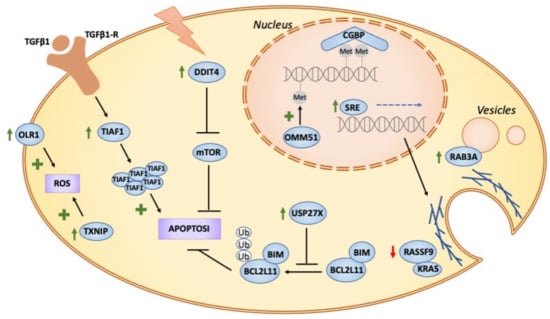 Schematic illustration of the proposed molecular mechanism of A. baumannii infection in mammalian cells. Based on our DEGs analysis we propose an increase in ROS production that may be due, in part, to the upregulation of OLR1 and TXNIP. Apoptosis is also activated by key genes, such as DDIT4, TIAF1 and BCL2L11. Additionally, the infection affects the vesicles traffic, via RAS and Rab3a, that may modulate the entrance and survival of the pathogen inside the host cell vesicles. In addition, cytoskeleton-related proteins that mediate vesicle traffic could be regulated in the nucleus by the transcription factor SRE. Finally, we suggest that epigenetic regulation through CGBP and DMM51 may play a role by regulating methylation in CpG islands.