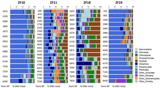 3.1. Past Diversity of the Microbial Eukaryotic Communities