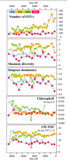 - Keck, F.; Millet, L.; Debroas, D.; Etienne, D.; Galop, D.; Rius, D.; Domaizon, I. Assessing the response of micro-eukaryotic diversity to the Great Acceleration using lake sedimentary DNA. Nat. Commun. 2020, 11, 1–8. [Google Scholar] [CrossRef] [PubMed]