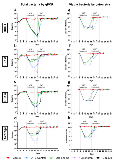 Effect of fecal microbiota transplantation (FMT) treatment on total bacteria. Experiments were performed as described in Figure 1 in triplicate with fecal samples from three healthy adult donors (Run1, Run2 and Run3). Different conditions were applied: no treatment (control, red), ciprofloxacin (ATB control, blue), ciprofloxacin and 30 g enema (green), ciprofloxacin and 10 g enema (purple), and ciprofloxacin with oral capsules (black). Total bacteria was determined by qPCR analysis and expressed as numbers of 16S rRNA gene copies/mL in Run1 to Run3 (subfigures (a–c)) or in mean number of copies/mL ± SEM (subfigure (d), n = 3). Total viable bacteria was determined by flow cytometry through a live/dead analysis and expressed as number of viable cells/mL in Run1 to Run3 (subfigures (e–g)) or in mean viable cells/mL ± SEM (subfigure (h), n = 3).