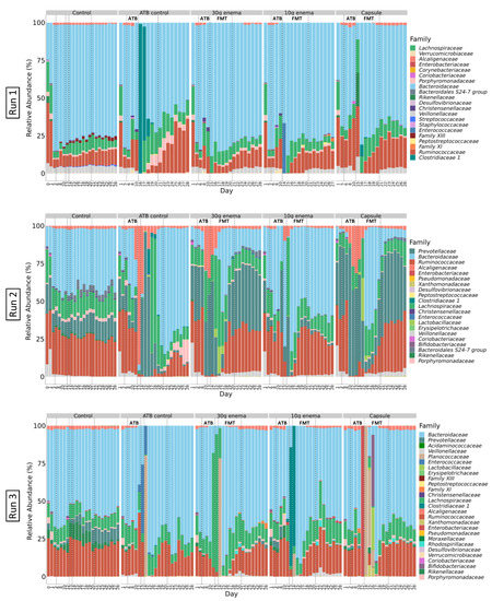 Experiments were performed as described in Figure 1 in triplicate with fecal samples from three healthy adult donors (Run1, Run2 and Run3). Different conditions were applied: no treatment (control), ciprofloxacin (ATB control), ciprofloxacin and 30 g enema, ciprofloxacin and 10 g enema, and ciprofloxacin with oral capsules. Microbial composition was determined at the family level by 16S rRNA gene sequencing and expressed as relative abundances.