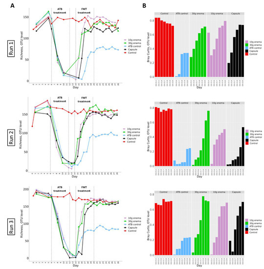 Experiments were performed as described in Figure 1 in triplicate with fecal samples from three healthy adult donors (Run1, Run2 and Run3). Different conditions were applied: no treatment (control, red), ciprofloxacin (ATB control, blue), ciprofloxacin and 30 g enema (green), ciprofloxacin and 10 g enema (purple), and ciprofloxacin with oral capsules (black). Richness (panel A) and Bray-Curtis (panel B, compared to day 6 values) indexes were determined at the OTU level after 16S-rRNA gene sequencing. Bray-Curtis values represent similarity of samples versus day 6.